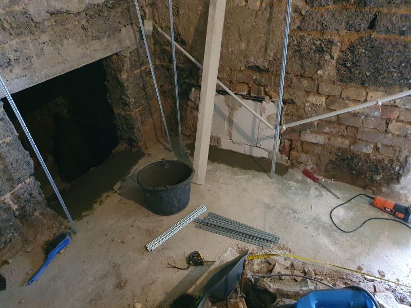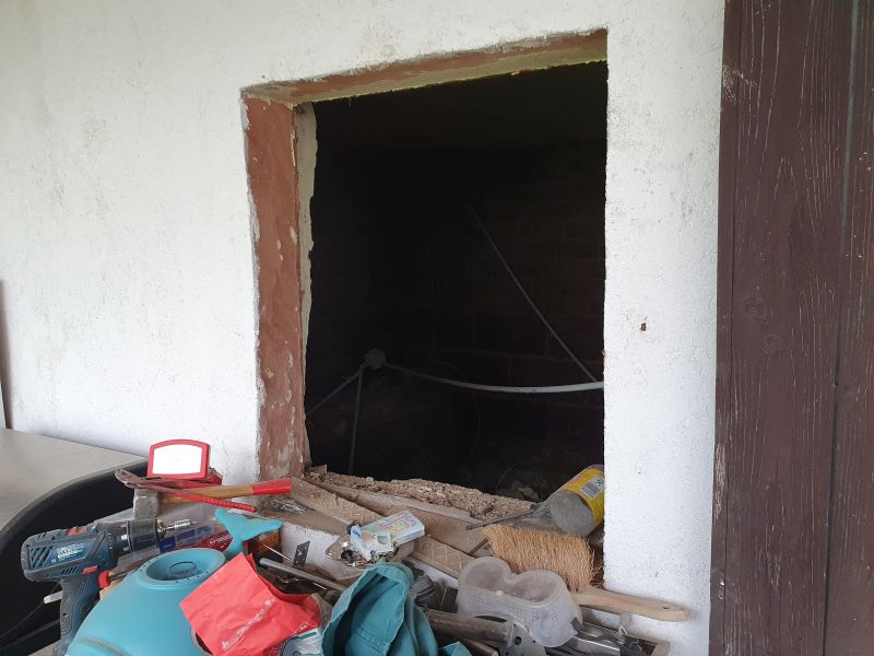 Hier war ein Trog, der von drin bis draußen ragte. Der wurde entfernt und das Loch aus Resten zugemauert.