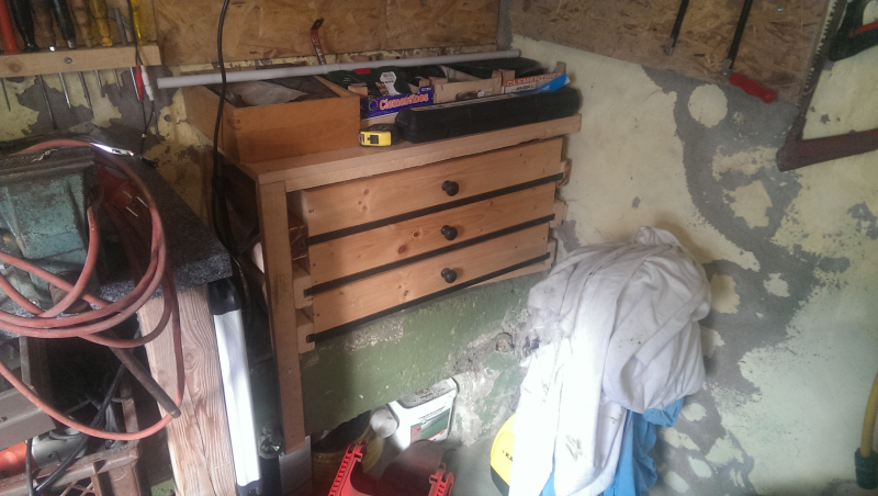 Auch die Wand mit den einzelnen Werkzeugen ist eine alte OSB-Platte, die ich noch übrige hatte. Somit konnte ich bequem mit Schrauben die Werkzeuge so anordnen, wie ich sie benötigte. Gleich rechts daneben habe ich mir passend ein Schubladen"schränkchen" zusammengezimmert. Die Schubladen sind aus dicken stabilen Holz zusammengezimmert.